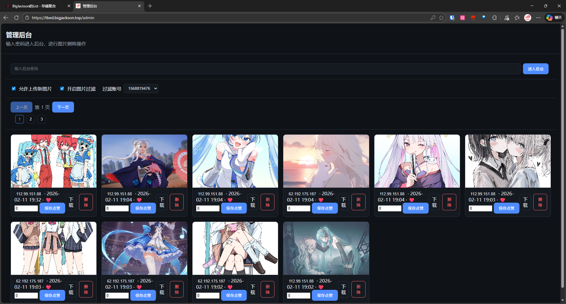 - 管理后台:分页、删除、保存点赞、允许上传开关、开启图片过滤开关