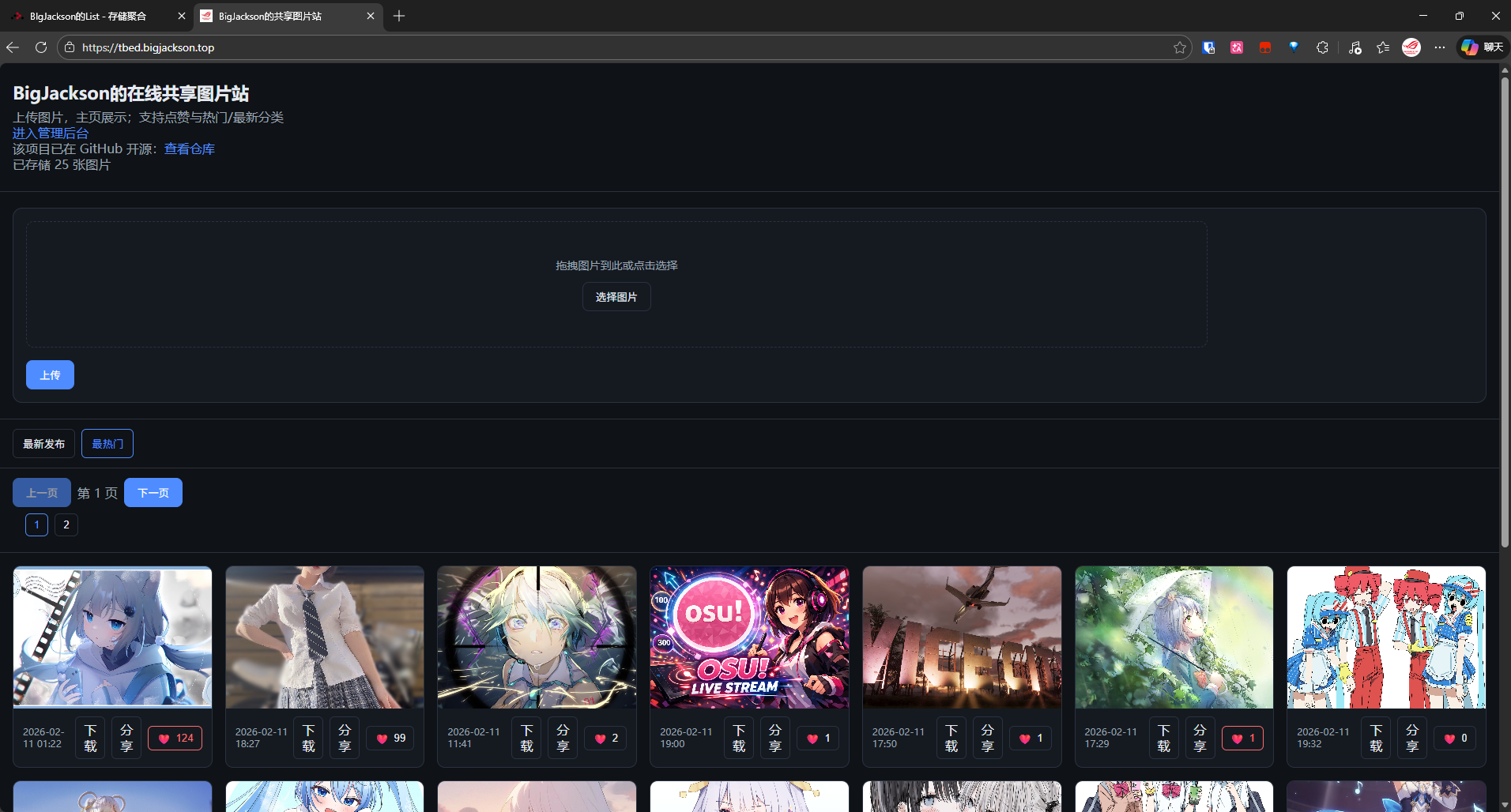 - Cloudflare KV(元信息与设置)/ D1(图片索引与点赞)